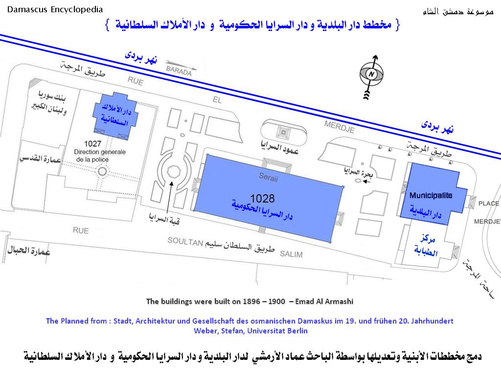 مخطط الأبنية الثلاث (دار البلدية و دار السرايا الحكومية و دار الأملاك السلطانية) على ضفاف نهر بردى . والمخطط منقول عن مجلد (مجتمع وعمارة مدينة دمشق العثمانية بالقرن التاسع عشر و أوائل القرن العشرين للباحث الدكتور شتيفان فيبر من جامعة برلين بألمانيا / تم دمج مخططات الأبنية الثلاث.
