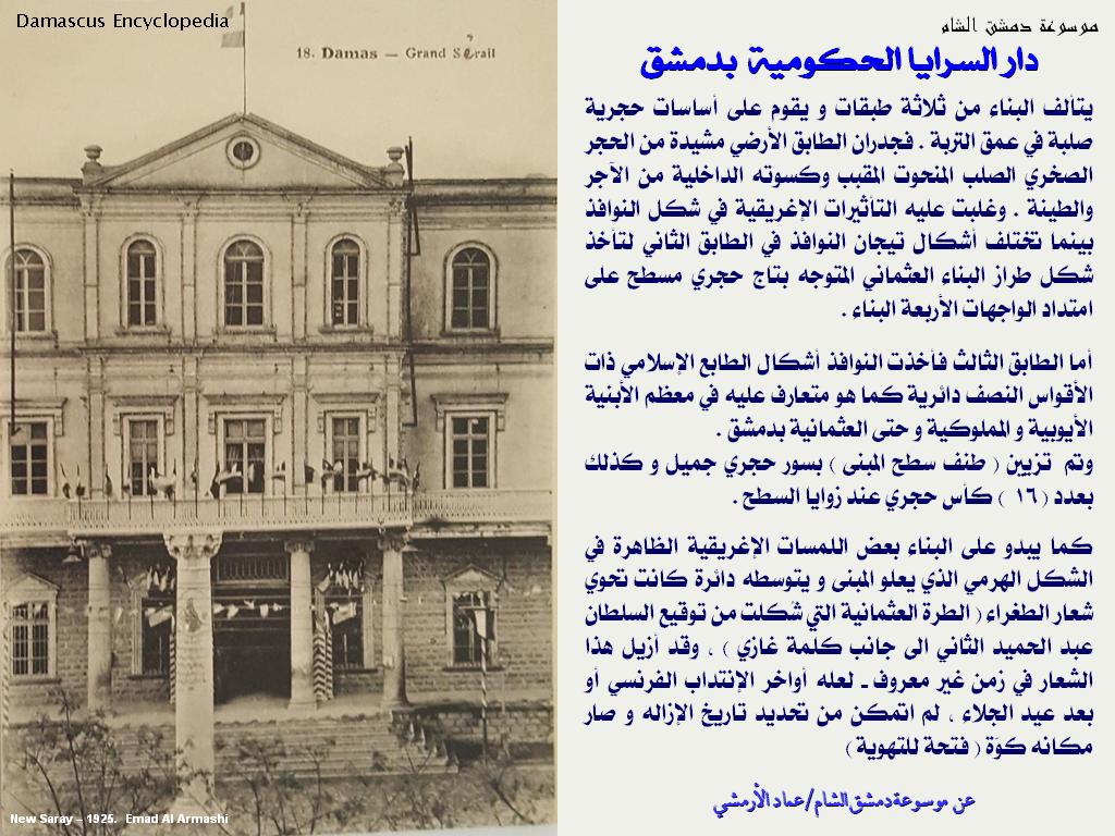 أنشئت دار السرايا الحكومية و المُـشاد عام 1900 من أضخم العمائر التي شُيدت بمدينة دمشق بذاك الوقت ، أنشئ في زمن الوالي المصلح حسين ناظم باشا خلف دار البلدية حين كان واليا على الشام .