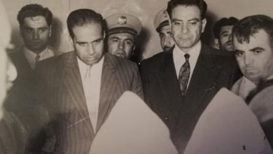 شكري القوتلي مع علي بوظو وزير الاقتصاد الوطني وأحمد سليمان الأحمد (بدوي الجبل) وزير الصحة ومنير العجلاني وزير العدل في حكومة سعيد الغزي الثانية عام 1955-1956