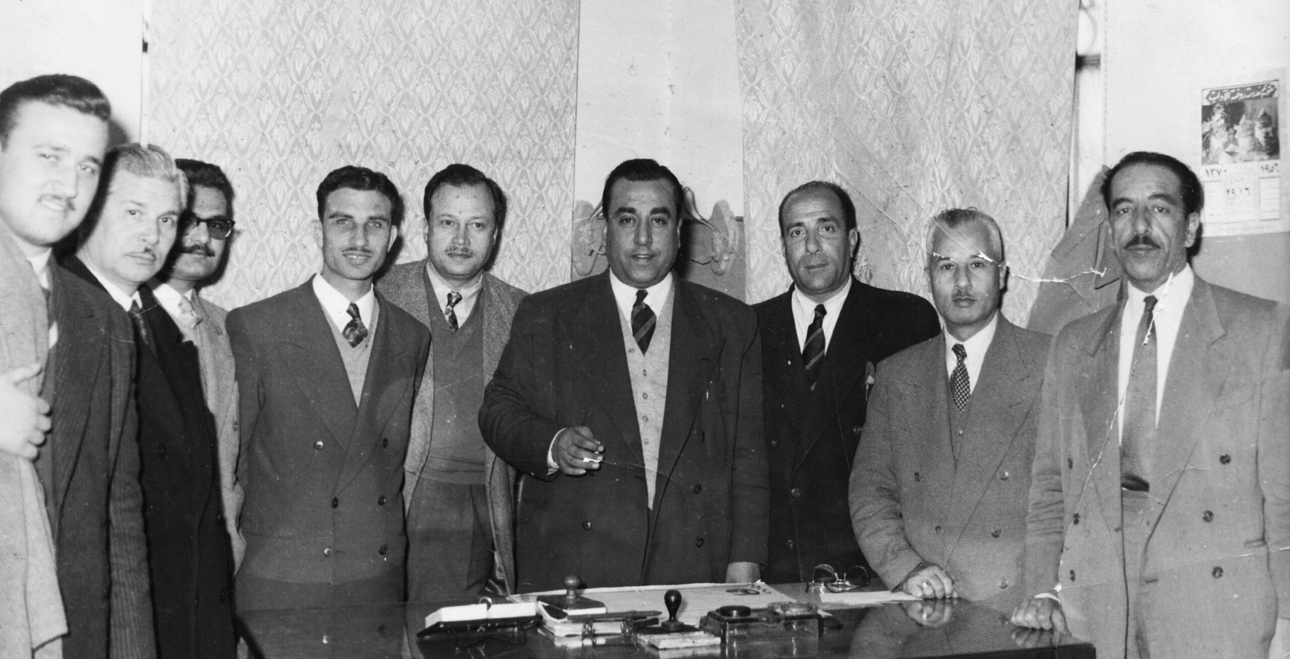 موفق البقاعي يتوسط زملاءه في مكتبه في وزارة الداخلية في حي المرجة بدمشق عام 1956