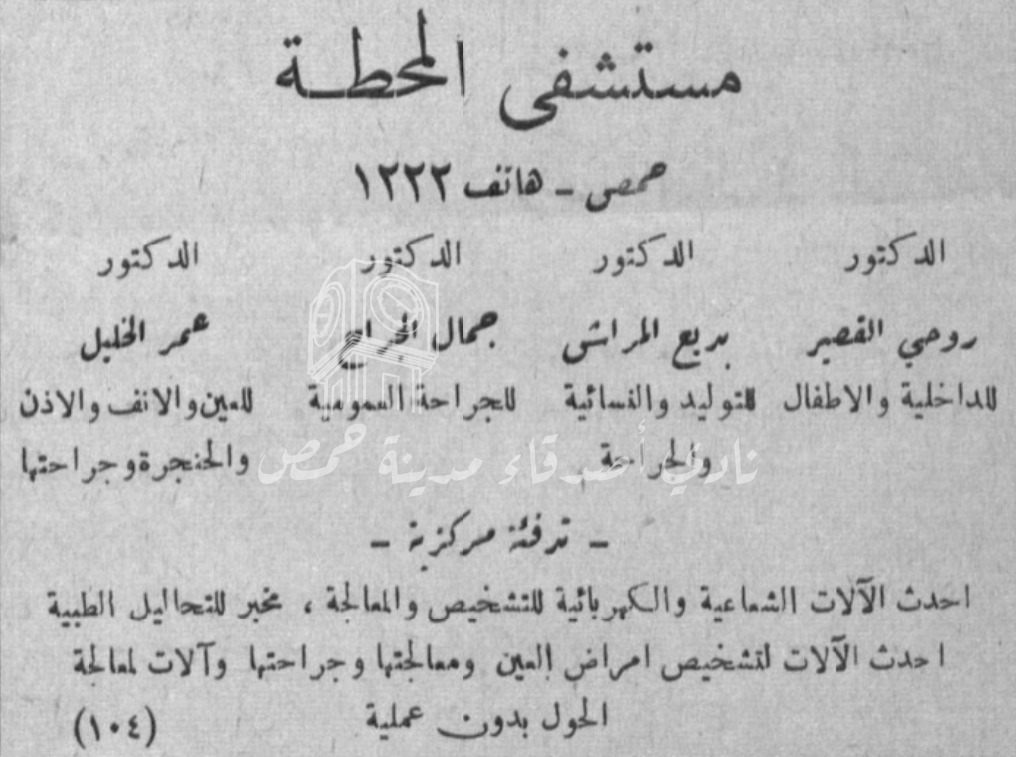 مستشفى المحطة في حمص من أرشيف صحف حمص في مثل هذا اليوم من عام 1950.