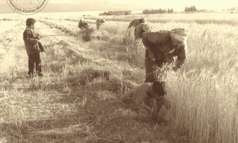 أكمل القراءة »حصاد موسم القمح يدوياً في سهول سلمية في ستينيات القرن العشرين. و تظهر في عمق الصوره بعض المزارع و الجبال…