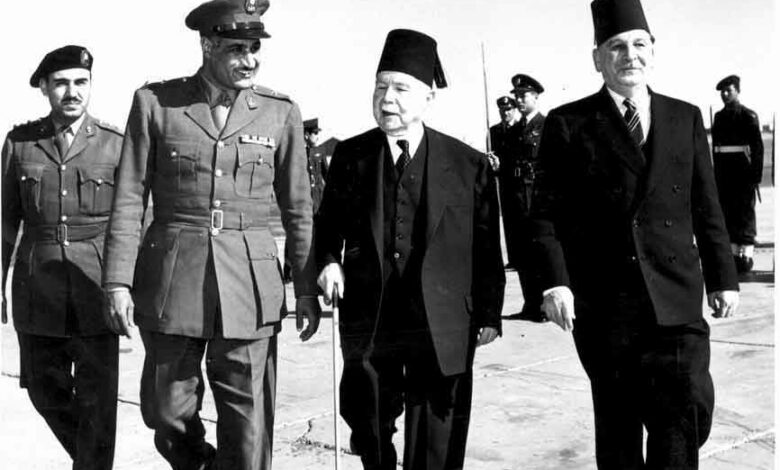 الرئيس جمال عبد الناصر يستقبل فارس الخوري رئيس الوزراء السوري وسامي الصلح رئيس الوزراء اللبناني بمطار الماظه الحربي في الحادي…