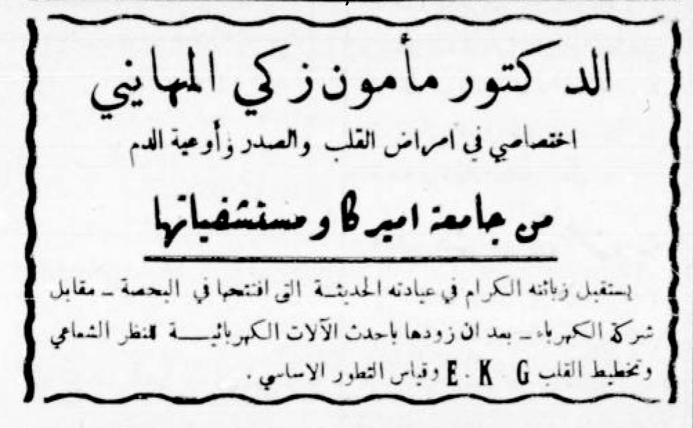 إعلان عن عيادة الدكتور مأمون المهايني عام 1949