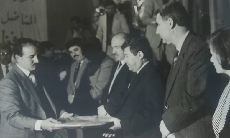 مدير مدرسة عبد الفتاح المقداد في بصرى الشام يتسلم جائرة من عبد الرزاق أيوب عام 1986م. الجائزة بمناسبة حصول الثانوية…