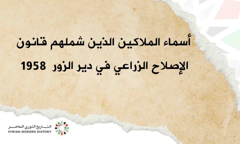 أكمل القراءة »أسماء المالكين المشمولين بأحكام قانون الإصلاح الزراعي رقم 161 لعام 1958 وتعديلاته بالمرسوم التشريعي رقم 88 لعام 1963 والقرى الواقع…