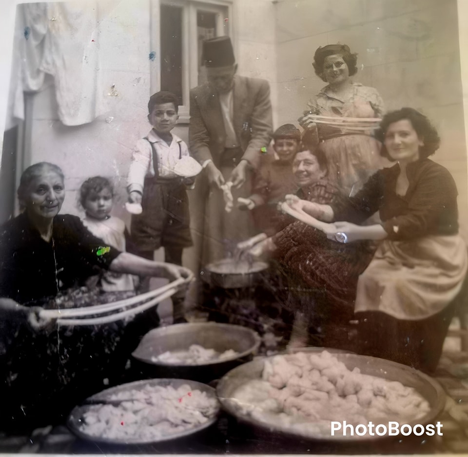في هذه الصورة القديمة مشهد بديع من الذاكرة الحلبية الجماعية، تحضير المونة، خاصة مونة الجبنة مشللة حيث تجتمع النساء ويتسامرن أحاديث العائلة والأصدقاء والجيران التي لا تنتهي، للتسلية وتمضية الوقت خلال تحضيرهنَّ لتلك المونة.