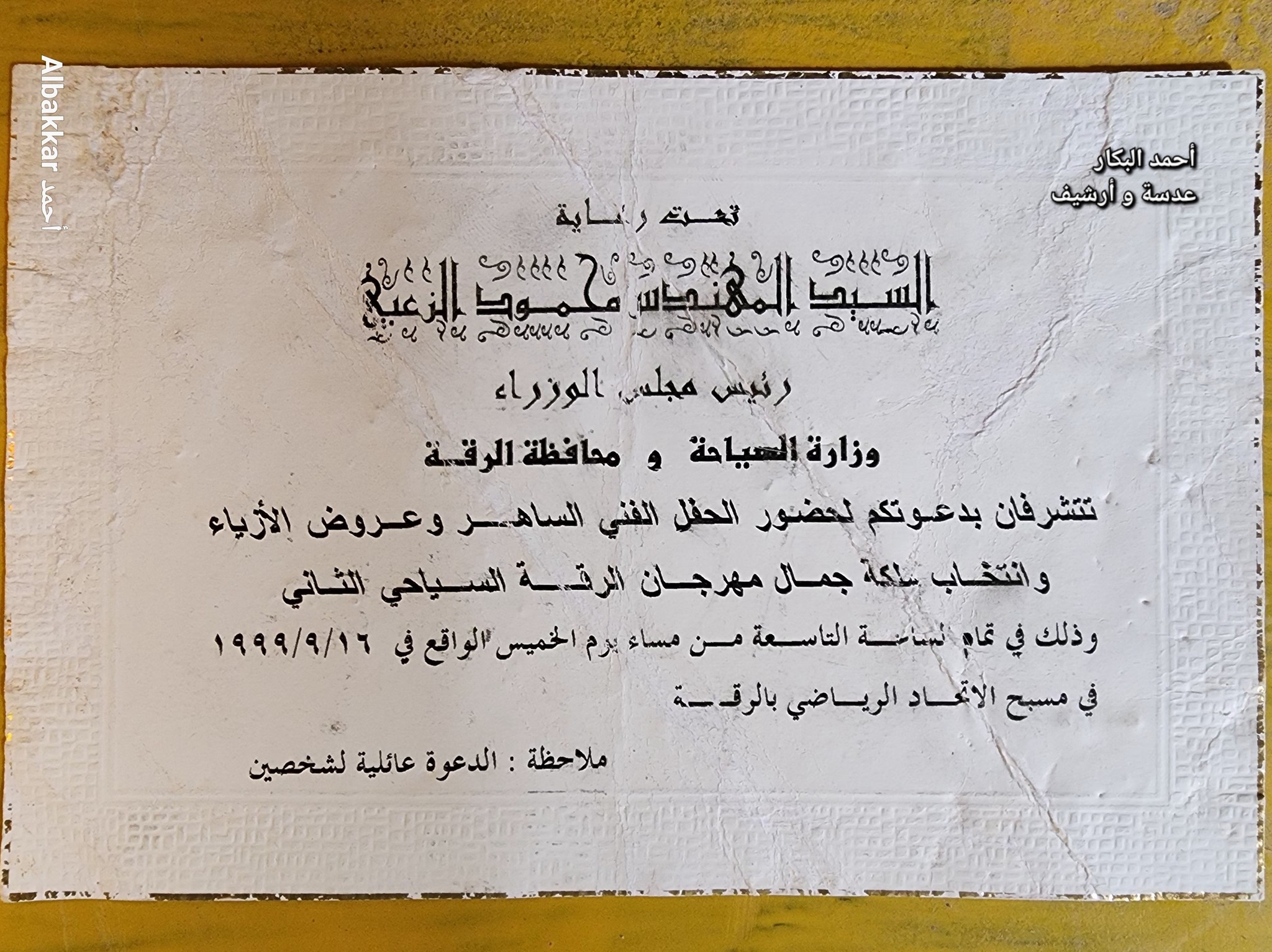 دعوة لحفل انتخاب ملكة جمال مهرجان الرقة السياحي الثاني عام 1999م