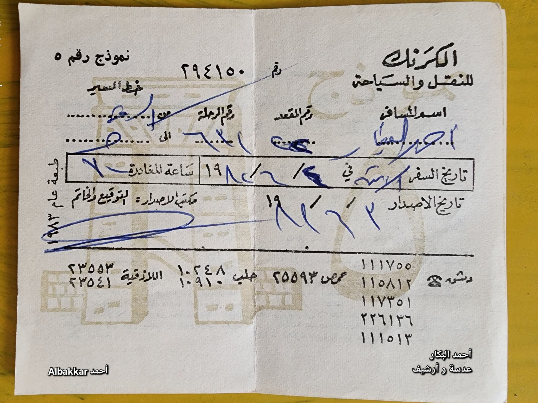 بطاقة سفر عبر شركة الكرنك- الرقة في الرابع من حزيران عام 1982م.