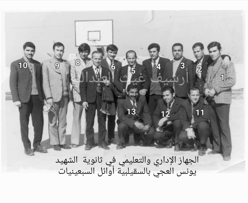 الجهاز الإداري والتعليمي في ثانوية الشهيد يونس العجي بالسقيلبية أوائل السبعينيات القرن العشرين.
