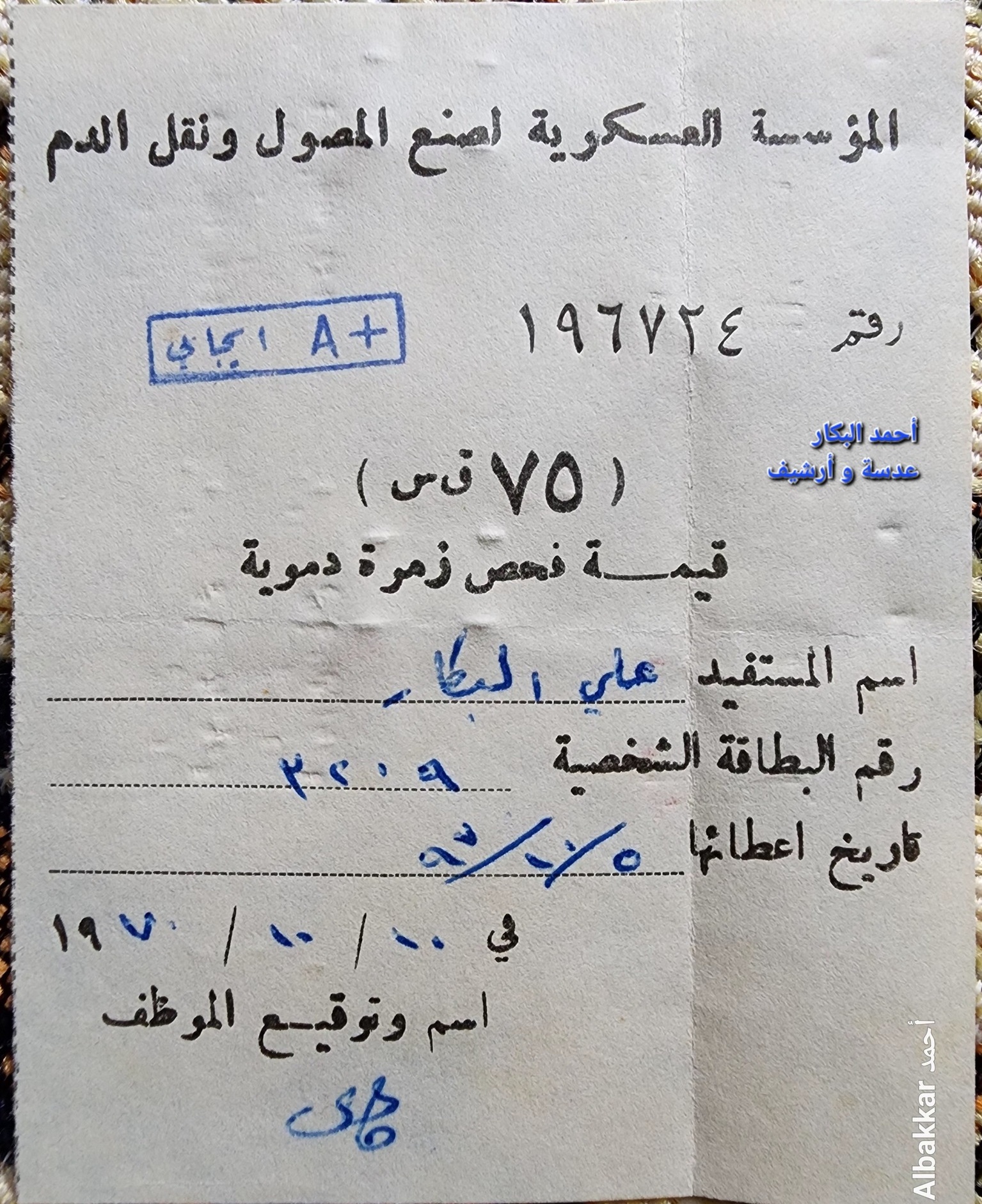 إيصال فحص زمرة الدم بقيمة 75 قرش سوري عام 1970