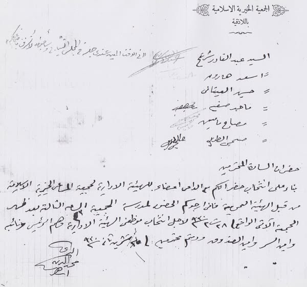 الزعيمُ عبد القادر شريتح، الحاجُّ مجد الدين الأزهريّ، المحافظُ الأسبقُ لمدينة اللاذقيَّة وجيه الأزهريّ، محمود زريق، الحاجُّ أديب وليد، والدكتور نديم شومان الذي رأس الجمعيَّة مدَّةً طويلةً واستطاع تثبيت دعائمها ووضع قواعد متينةً لها وأوجد موارد ماليَّةً لاستمرارها.