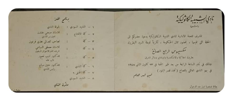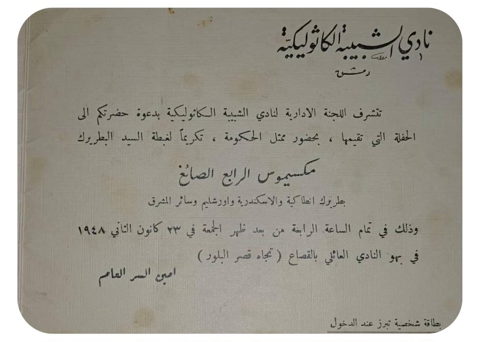 بطاقة حفل تكريم البطريرك مكسيموس الرابع الصائغ عام 1948م