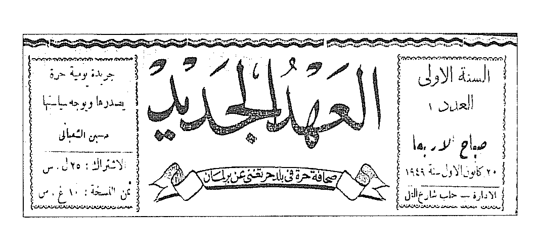 صدرت صحيفة العهد الجديد لصاحبها حسين الشعباني في حلب في العشرين من كانون الأول عام 1949م.