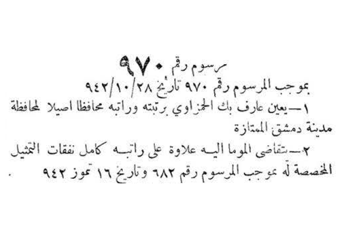 عين عارف الحمزاوي بموجب المرسوم رقم 970 الصادر في الثامن والعشرين من تشرين الأول عام 1942 محافظاً أصيلاً لمدينة دمشق الممتازة.