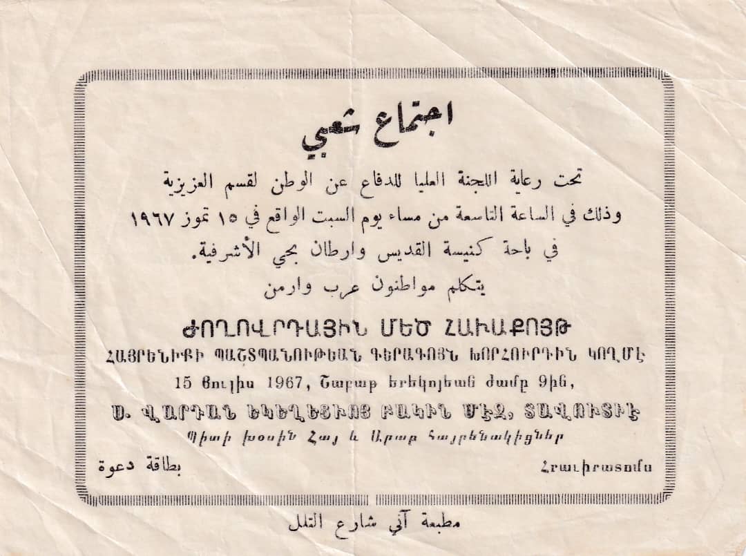 بطاقة دعوة لاجتماع شعبي للجنة العليا للدفاع عن الوطن عام 1967