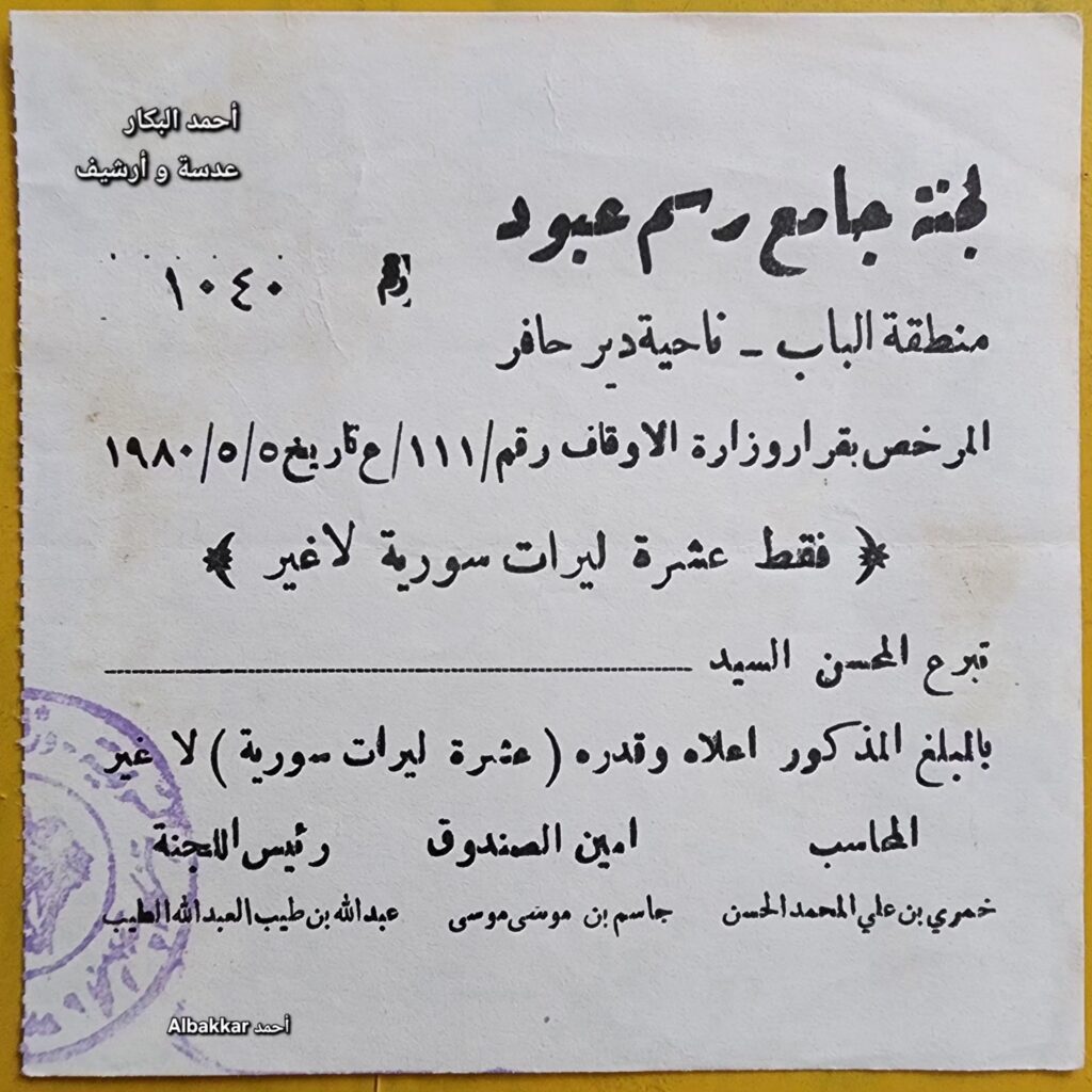 إيصال تبرع بـ 10 ليرات سورية لـ مسجد رسم عبود في دير حافر عام 1980م