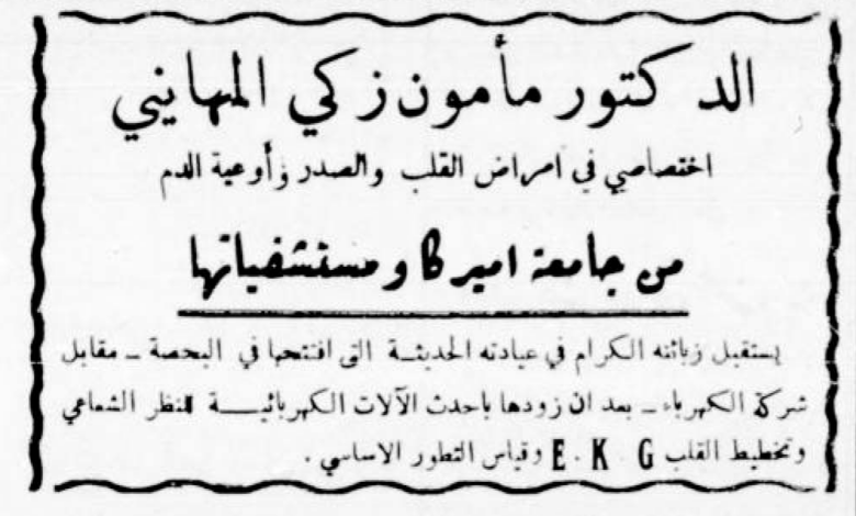 أكمل القراءة »إعلان عن عيادة الدكتور مأمون المهايني عام 1949 تقع العيادة في البحصة في دمشق. عين الدكتور مأمون المهايني في عام…