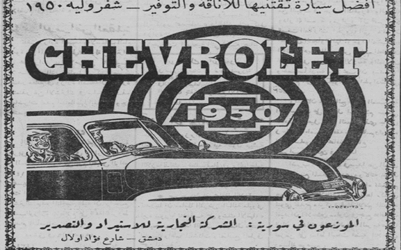 إعلان سيارات شفروليه في سورية عام 1950م نشر الإعلان في صحيفة الإنشاء – دمشق العدد 3321 الصادر في الحادي عشر…